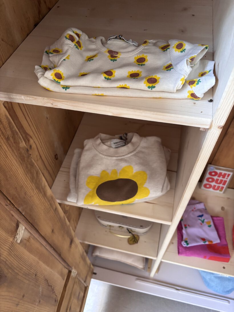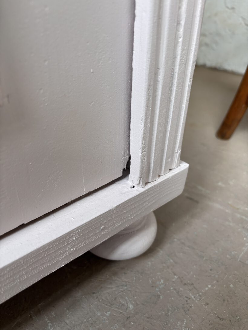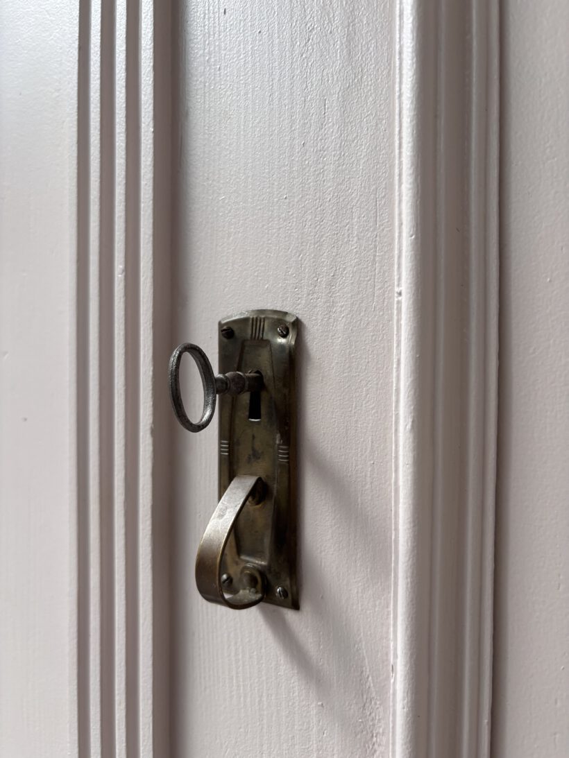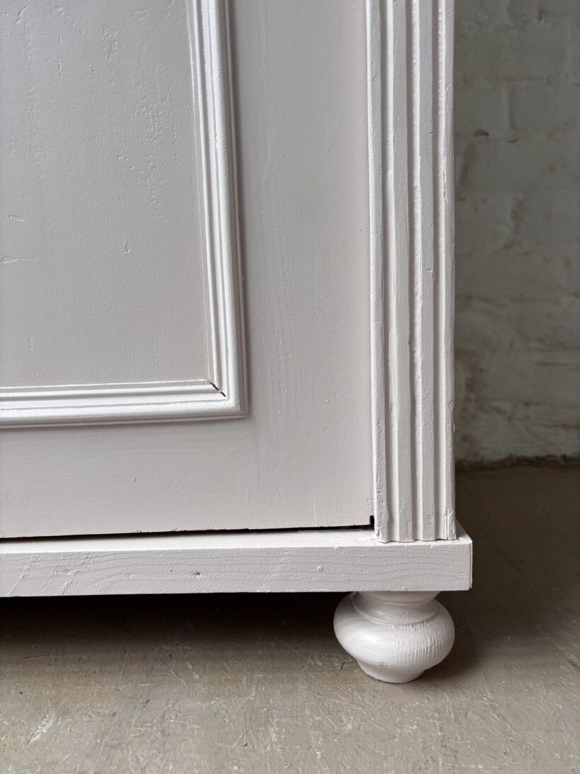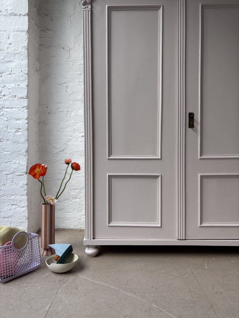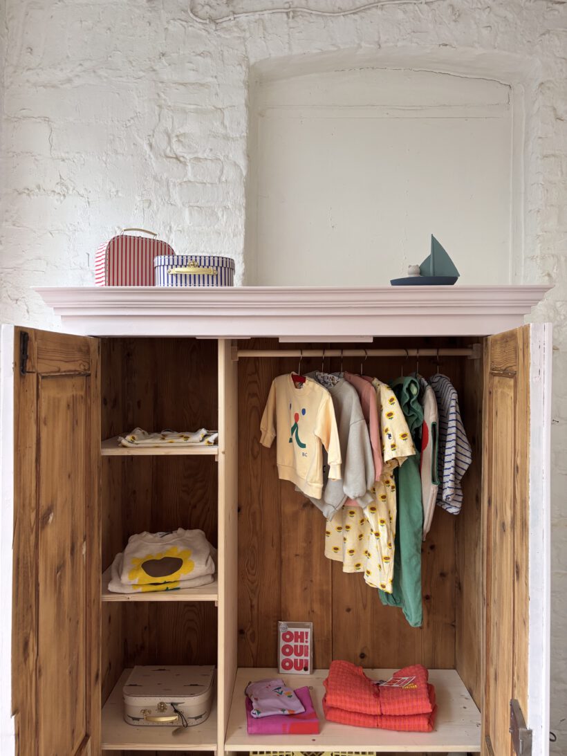 Zelda wurde von uns restauriert, repariert, lackiert und innen neu besetzt. Sie hat neue Füße bekommen und teilweise wurden sehr alte poröse Hölzer und Stellen ausgetauscht. Nun steht sie stabil, stark und lebensfroh – bereit für eine oder mehrere neue Lebensrunden. Innen haben wir Zelda ein komplett neues Innenleben verpasst. Böden links, rechts eine Kleiderstange und ein Boden. Wunderschön! Der Platz wird perfekt ausgenutzt und bietet viel Stauraum.